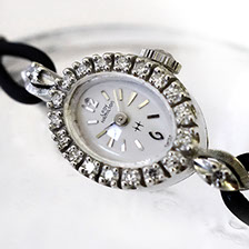 14Kホワイトゴールドのケース。取り巻いたダイヤモンドの輝きも派手過ぎず、その品のある佇まいは、レディーハミルトンの呼び名にふさわしい、